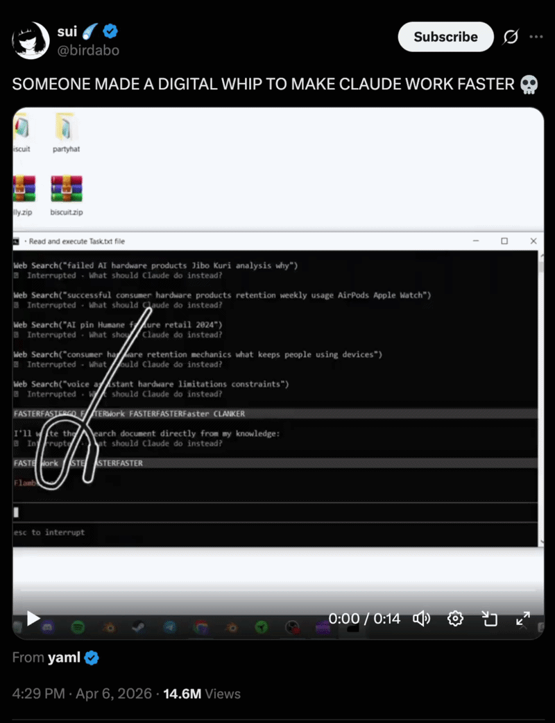 😄 Someone built a literal digital whip - yes, a whip that cracks every time Claude pauses mid-response, as a joke tool to "motivate" the AI to work faster, and 14 million people found it deeply relatable.